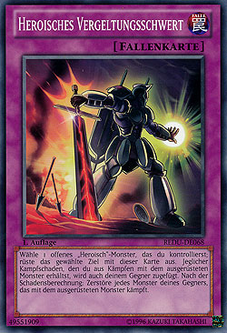 Wähle 1 offenes „Heroisch“-Monster, das du kontrollierst; rüste das gewählte Ziel mit dieser Karte aus. Jeglicher Kampfschaden, den du aus Kämpfen mit dem ausgerüsteten Monster erhälst, wird auch deinem Gegner zugefügt. Nach der Schadensberechnung: Zerstöre jedes Monster deines Gegners, das mit dem ausgerüsteten Monster kämpft.