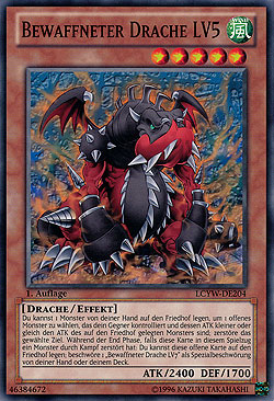 Du kannst 1 Monster von deiner Hand auf den Friedhof legen, um 1 offenes Monster zu wählen, das dein Gegner kontrolliert und dessen ATK kleiner oder gleich den ATK des auf den Friedhofgelegten Monsters sind; zerstöre das gewählte Ziel. Während der End Phase, falls diese Karte ein Monster durch Kampf zerstört hat: Du kannst diese offene Karte auf den Friedhof legen; beschwöre 1 „Bewaffneter Drache LV7“ als Spezialbeschwörung von deiner Hand oder deinem Deck.