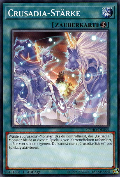 Wähle 1 „Crusadia“-Monster, das du kontrollierst; das „Crusadia“-Monster bleibt in diesem Spielzug von Karteneffekten unberührt, außer von seinen eigenen. Du kannst nur 1 „Crusadia-Stärke“ pro Spielzug aktivieren.