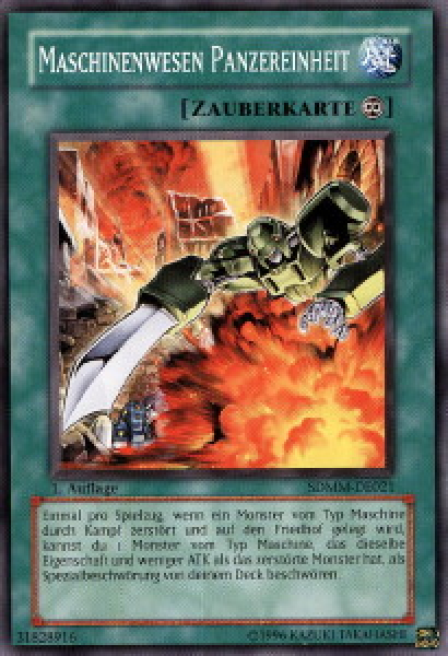 Einmal pro Spielzug, wenn ein Monster vom Typ Maschine durch Kampf zerstört und auf deinen Friedhof gelegt wird: Du kannst 1 Monster vom Typ Maschine, das dieselbe Eigenschaft und weniger ATK als das zerstörte Monster im Friedhof hat, als Spezialbeschwörung von deinem Deck beschwören.