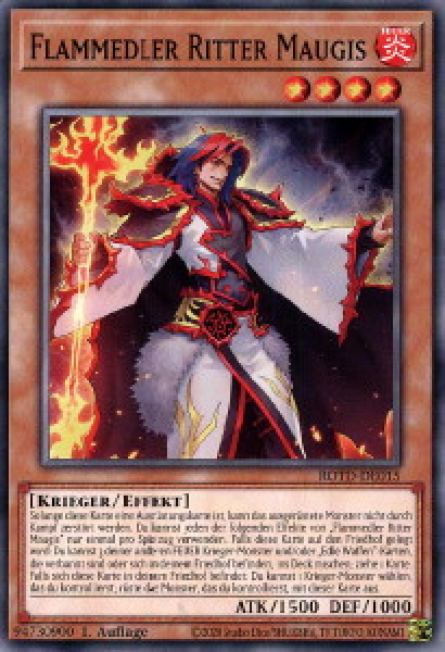 Solange diese Karte eine Ausrüstungskarte ist, kann das ausgerüstete Monster nicht durch Kampf zerstört werden. Du kannst jeden der folgenden Effekte von „Flammedler Ritter Maugis“ nur einmal pro Spielzug verwenden. Falls diese Karte auf den Friedhof gelegt wird: Du kannst 3 deiner anderen FEUER Krieger-Monster und/oder „Edle Waffen“-Karten, die verbannt sind oder sich in deinem Friedhof befinden, ins Deck mischen; ziehe 1 Karte. Falls sich diese Karte in deinem Friedhof befindet: Du kannst 1 Krieger-Monster wählen, das du kontrollierst; rüste das Monster, das du kontrollierst, mit dieser Karte aus.