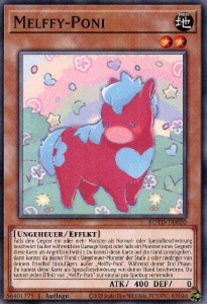 Falls dein Gegner ein oder mehr Monster als Normal- oder Spezialbeschwörung beschwört (außer während des Damage Steps) oder falls ein Monster eines Gegners diese Karte als Angriffsziel wählt: Du kannst diese Karte auf die Hand zurückgeben, dann kannst du deiner Hand 1 Ungeheuer-Monster der Stufe 2 oder niedriger von deinem Friedhof hinzufügen, außer „Melffy-Poni“. Während deiner End Phase: Du kannst diese Karte als Spezialbeschwörung von deiner Hand beschwören. Du kannst jeden Effekt von „Melffy-Poni“ nur einmal pro Spielzug verwenden.