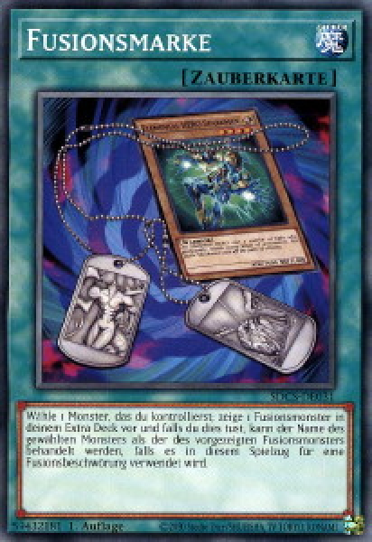 Wähle 1 Monster, das du kontrollierst; zeige 1 Fusionsmonster in deinem Extra Deck vor und falls du dies tust, kann der Name des gewählten Monsters als der des vorgezeigten Fusionsmonsters behandelt werden, falls es in diesem Spielzug für eine Fusionsbeschwörung verwendet wird.