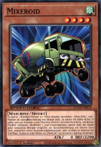 Du kannst 1 Maschine-Monster als Tribut anbieten; beschwöre 1 Nicht-WIND „roid“-Monster als Spezialbeschwörung von deinem Deck. Du kannst die Hälfte deiner LP zahlen und eine beliebige Anzahl Maschine-Monster, einschließlich dieser Karte, von deinem Friedhof verbannen; beschwöre 1 „roid“-Fusionsmonster, dessen Stufe gleich der Anzahl der verbannten Monster ist, als Spezialbeschwörung von deinem Extra Deck, ungeachtet seiner Beschwörungsbedingungen, aber zerstöre es während der End Phase. Du kannst jeden Effekt von „Mixeroid“ nur einmal pro Spielzug verwenden.