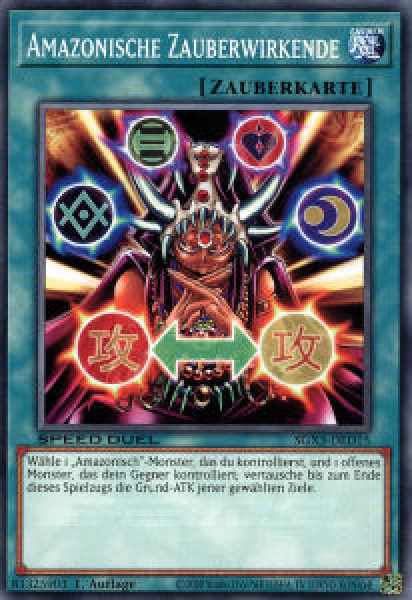 Wähle 1 „Amazonisch“-Monster, das du kontrollierst, und 1 offenes Monster, das dein Gegner kontrolliert; vertausche bis zum Ende dieses Spielzugs die Grund-ATK der gewählten Ziele.