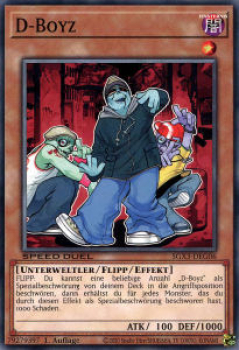 FLIPP: Du kannst eine beliebige Anzahl „D-Boyz“ als Spezialbeschwörung von deinem Deck in die offene Angriffsposition beschwören, dann erhältst du 1000 Schaden für jedes Monster, das du durch diesen Effekt als Spezialbeschwörung beschworen hast.
