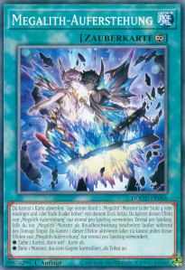 Du kannst 1 Karte abwerfen ; füge deiner Hand 1 „ Megalith“ -Monster der Stufe 4 oder niedriger und 1 „ Megalith “ -Monster der Stufe 8 oder höher von deinem Deck hinzu . Du kannst diesen Effekt von „Megalith Anastasis“ nur einmal pro Spielzug verwenden . Einmal pro Spielzug, falls du ein oder mehr „Megalith“-Monster als Ritualbeschwörung beschwörst : Du kannst 1 dieser Effekte aktivieren (aber du kannst jeden Effekt von „Megalith Anastasis“ nur einmal pro Spielzug verwenden); ● Ziehe 2 Karten und wirf dann 1 Karte ab . ● Biete 1 Monster als Tribut an, das dein Gegner kontrolliert .