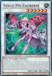 Falls diese Karte als Synchrobeschwörung beschworen wird : Du kannst 1000 LP zahlen ; setze 1 normalen oder Schnellspiel-Zauberspruch „ Teleport “ von deinem Deck , Friedhof oder deiner Verbannung . Falls diese als Synchrobeschwörung beschworene Karte auf den Friedhof gelegt wird: Du kannst 1 Karte wählen , die dein Gegner kontrolliert , oder bis zu 2, falls du ein Psi - Fusions- oder Synchromonster kontrollierst ; gib diese Karte(n) auf die Hand zurück. Du kannst jeden Effekt von „Gelassene Psi-Zauberin“ nur einmal pro Spielzug verwenden .