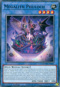 Du kannst diese Karte mit einer beliebigen „ Megalith “-Karte als Ritualbeschwörung beschwören . Falls diese Karte als Ritualbeschwörung beschworen wird: Du kannst deiner Hand 1 „Megalith“-Karte von deinem Friedhof hinzufügen . Während der Main Phase ( Schnelleffekt ): Du kannst 1 „Megalith“ -Ritualmonster von deinem Friedhof als Ritualbeschwörung beschwören, außer „Megalith Phuloch“, indem du Monster von deiner Hand oder Spielfeldseite als Tribut anbietest , einschließlich dieser Karte auf deiner Spielfeldseite, deren gemeinsame Stufen gleich oder höher sind als die Stufe des Ritualmonsters. Du kannst diesen Effekt von „Megalith Phuloch“ nur einmal pro Spielzug verwenden und nicht beide Effekte von „Megalith Phuloch“ in derselben Kette aktivieren .