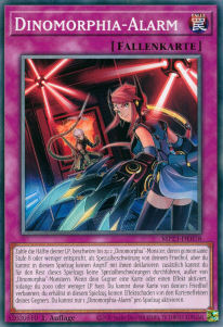 Zahle die Hälfte deiner LP; beschwöre bis zu 2 „Dinomorphia“-Monster, deren gemeinsame Stufe 8 oder weniger entspricht, als Spezialbeschwörung von deinem Friedhof, aber du kannst in diesem Spielzug keinen Angriff mit ihnen deklarieren, zusätzlich kannst du für den Rest dieses Spielzugs keine Spezialbeschwörungen durchführen, außer von „Dinomorphia“-Monstern. Wenn dein Gegner eine Karte oder einen Effekt aktiviert, solange du 2000 oder weniger LP hast: Du kannst diese Karte von deinem Friedhof verbannen; du erhältst in diesem Spielzug keinen Effektschaden von den Karteneffekten deines Gegners. Du kannst nur 1 „Dinomorphia-Alarm“ pro Spielzug aktivieren.