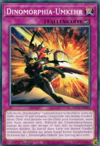Falls du ein „Dinomorphia“-Fusionsmonster kontrollierst: Zahle die Hälfte deiner LP und verbanne 1 Konterfalle von deinem Friedhof; dieser Effekt wird derselbe wie der Effekt der Konterfalle, wenn die Karte aktiviert wird. Während der Schadensberechnung, solange du 2000 oder weniger LP hast, falls du Kampfschaden erhalten würdest: Du kannst diese Karte von deinem Friedhof verbannen; du erhältst aus dem Kampf keinen Kampfschaden. Du kannst nur 1 „Dinomorphia-Umkehr“ pro Spielzug aktivieren.