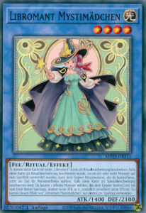 Du kannst diese Karte mit einer „Libromant“-Karte als Ritualbeschwörung beschwören. Falls diese Karte als Ritualbeschwörung beschworen wurde, indem ein oder mehr Monster auf dem Spielfeld verwendet wurden, kann dein Gegner Ritualmonster, die du kontrollierst, nicht als Ziel für Monstereffekte wählen. Falls diese Karte als Spezialbeschwörung beschworen wird: Du kannst 1 offenes Monster wählen, das dein Gegner kontrolliert; bis zum Ende dieses Spielzugs, ändere seine ATK zu 0, zusätzlich annulliere seine Effekte. Du kannst diesen Effekt von „Libromant Mystimädchen“ nur einmal pro Spielzug verwenden.