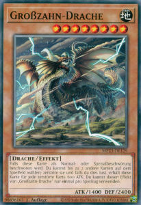 Falls diese Karte als Normal- oder Spezialbeschwörung beschworen wird: Du kannst bis zu 2 andere Karten auf dem Spielfeld wählen; zerstöre sie und falls du dies tust, erhält diese Karte für jede zerstörte Karte 600 ATK. Du kannst diesen Effekt von „Großzahn-Drache“ nur einmal pro Spielzug verwenden.