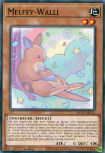 Falls dein Gegner ein oder mehr Monster als Normal- oder Spezialbeschwörung beschwört (außer während des Damage Steps) oder falls ein Monster eines Gegners diese Karte als Angriffsziel wählt: Du kannst diese Karte auf die Hand zurückgeben, dann kannst du 2 „Melffy“-Monster mit unterschiedlichen Namen voneinander als Spezialbeschwörung von deinem Deck beschwören, außer „Melffy-Walli“. Während deiner End Phase: Du kannst diese Karte als Spezialbeschwörung von deiner Hand beschwören. Du kannst jeden Effekt von „Melffy-Walli“ nur einmal pro Spielzug verwenden.