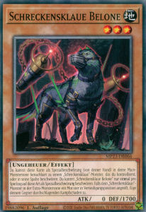 Du kannst diese Karte als Spezialbeschwörung (von deiner Hand) in deine Main-Monsterzone benachbart zu einem „Schreckensklaue“-Monster, das du kontrollierst, oder in seine Spalte beschwören. Du kannst „Schreckensklaue Belone“ nur einmal pro Spielzug auf diese Art als Spezialbeschwörung beschwören. Falls dein „Schreckensklaue“-Monster in der Extra-Monsterzone ein Monster in Verteidigungsposition angreift, füge deinem Gegner durchschlagenden Kampfschaden zu.
