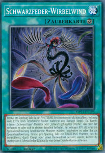 Einmal pro Spielzug, falls du ein FINSTERNIS Synchromonster als Spezialbeschwörung vom Extra Deck beschwörst (außer während des Damage Steps): Du kannst 1 deiner „Schwarzflügel“-Monster oder „Schwarz geflügelter Drache“, das oder der verbannt ist oder sich in deinem Friedhof befindet, mit weniger ATK als jenes als Spezialbeschwörung beschworene Monster wählen; beschwöre es oder ihn als Spezialbeschwörung. Einmal pro Spielzug, falls ein FINSTERNIS Monster, das du kontrollierst, durch Kampf oder einen Karteneffekt zerstört würde, kannst du stattdessen 1 Schwarzfeder-Zählmarke von deiner Spielfeldseite entfernen.