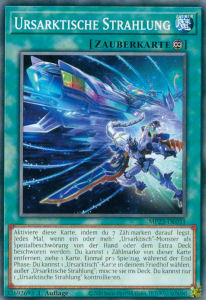 Aktiviere diese Karte, indem du 7 Zählmarken darauf legst. Jedes Mal, wenn ein oder mehr „Ursarktisch“-Monster als Spezialbeschwörung von der Hand oder dem Extra Deck beschworen werden: Du kannst 1 Zählmarke von dieser Karte entfernen; ziehe 1 Karte. Einmal pro Spielzug, während der End Phase: Du kannst 1 „Ursarktisch“-Karte in deinem Friedhof wählen, außer „Ursarktische Strahlung“; mische sie ins Deck. Du kannst nur 1 „Ursarktische Strahlung“ kontrollieren.