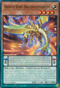 Falls diese Karte als Normal- oder Spezialbeschwörung beschworen wird: Du kannst deiner Hand 1 offenes „Oberster König Drache“- oder „Oberster König Tor“-Pendelmonster von deinem Extra Deck hinzufügen, dann, sofort nachdem dieser Effekt aufgelöst wurde, kannst du 1 „Oberster König Drache“-Monster als Synchro- oder Xyz-Beschwörung beschwören. Falls ein oder mehr offene Pendelmonster, die du kontrollierst, durch Kampf oder einen Karteneffekt zerstört werden, solange sich diese Karte offen in deinem Extra Deck befindet: Du kannst diese Karte deiner Hand hinzufügen. Du kannst jeden Effekt von „Oberster König Drachenlichtgewürm“ nur einmal pro Spielzug verwenden.