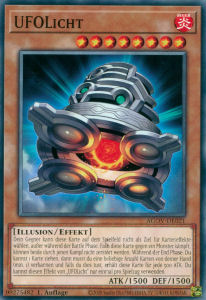 Dein Gegner kann diese Karte auf dem Spielfeld nicht als Ziel für Karteneffekte wählen, außer während der Battle Phase. Falls diese Karte gegen ein Monster kämpft, können beide durch jenen Kampf nicht zerstört werden. Während der End Phase: Du kannst 1 Karte ziehen, dann musst du eine beliebige Anzahl Karten von deiner Hand (min. 1) verbannen und falls du dies tust, erhält diese Karte für jede 500 ATK. Du kannst diesen Effekt von „UFOLicht“ nur einmal pro Spielzug verwenden.
