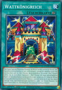 Dein Gegner kann die Effekte eines Monsters, die aktiviert werden, wenn es als Normal- oder Spezialbeschwörung beschworen wird, nicht aktivieren, solange es in derselben Spalte liegt wie diese Karte oder ein „Watt“-Monster, das du kontrollierst. Du kannst 1 „Watt“-Monster wählen, das du kontrollierst; beschwöre 1 „Watt“-Monster mit einem unterschiedlichen Namen als Spezialbeschwörung von deinem Deck, dann verlierst du LP in Höhe der ATK des als Spezialbeschwörung beschworenen Monsters, zusätzlich kannst du für den Rest dieses Spielzugs keine Spezialbeschwörungen durchführen, außer von Donner-Monstern. Du kannst diesen Effekt von „Wattkönigreich“ nur einmal pro Spielzug verwenden.
