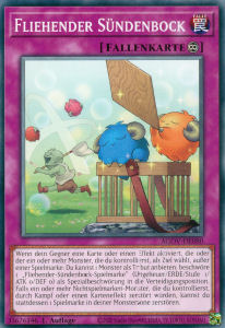 Wenn dein Gegner eine Karte oder einen Effekt aktiviert, die oder der ein oder mehr Monster, die du kontrollierst, als Ziel wählt, außer einer Spielmarke: Du kannst 1 Monster als Tribut anbieten; beschwöre 1 „Fliehender-Sündenbock-Spielmarke“ (Ungeheuer/ERDE/Stufe 1/ATK 0/DEF 0) als Spezialbeschwörung in die Verteidigungsposition. Falls ein oder mehr Nichtspielmarken-Monster, die du kontrollierst, durch Kampf oder einen Karteneffekt zerstört würden, kannst du stattdessen 1 Spielmarke in deiner Monsterzone zerstören.
