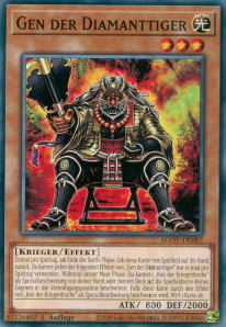 Einmal pro Spielzug, am Ende der Battle Phase: Gib diese Karte vom Spielfeld auf die Hand zurück. Du kannst jeden der folgenden Effekte von „Gen der Diamanttiger“ nur einmal pro Spielzug verwenden. Während deiner Main Phase: Du kannst 1 „Ken der Kriegerdrache“ als Spezialbeschwörung von deiner Hand oder deinem Deck auf die Spielfeldseite deines Gegners in die Verteidigungsposition beschwören. Falls diese Karte durch den Effekt von „Ken der Kriegerdrache“ als Spezialbeschwörung beschworen wird: Wirf 1 Karte ab.