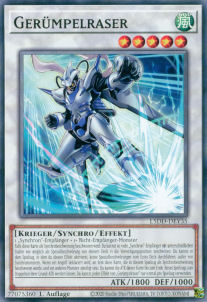 Falls diese Karte als Synchrobeschwörung beschworen wird: Du kannst so viele „Synchron“-Empfänger mit unterschiedlichen Stufen wie möglich als Spezialbeschwörung von deinem Deck in die Verteidigungsposition beschwören. Du kannst in dem Spielzug, in dem du diesen Effekt aktivierst, keine Monster als Spezialbeschwörung vom Extra Deck beschwören, außer Synchromonstern. Wenn ein Angriff deklariert wird, an dem diese Karte, die in diesem Spielzug als Synchrobeschwörung beschworen wurde, und ein anderes Monster beteiligt sind: Du kannst die ATK dieser Karte bis zum Ende dieses Spielzugs zum Doppelten ihrer Grund-ATK werden lassen. Du kannst jeden Effekt von „Gerümpelraser“ nur einmal pro Spielzug verwenden.