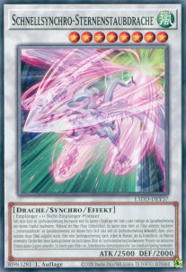 Falls diese Karte als Synchrobeschwörung beschworen wird: Du kannst 1 Empfänger der Stufe 2 oder niedriger als Spezialbeschwörung von deinem Friedhof beschwören. Während der Main Phase (Schnelleffekt): Du kannst diese Karte als Tribut anbieten; beschwöre 1 „Sternenstaubdrache“ als Spezialbeschwörung von deinem Extra Deck (dies wird als Synchrobeschwörung behandelt), dann, sofort nachdem dieser Effekt aufgelöst wurde, führe eine Synchrobeschwörung durch und verwende dafür Monster, die du kontrollierst, als Material. Für den Rest dieses Spielzugs bleiben die durch diesen Effekt als Synchrobeschwörung beschworenen Monster von aktivierten Effekten deines Gegners unberührt. Du kannst jeden Effekt von „Schnellsynchro-Sternenstaubdrache“ nur einmal pro Spielzug verwenden.