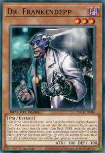 Falls diese Karte als Normal- oder Spezialbeschwörung beschworen wird: Du kannst 500 LP zahlen; sieh dir die oberste Karte deines Decks an, dann lege sie unter dein Deck ODER zeige sie vor und füge sie deiner Hand hinzu, aber überspringe deine nächste Draw Phase, falls sie der Hand hinzugefügt wird. Du kannst diesen Effekt von „Dr. Frankendepp“ nur einmal pro Spielzug verwenden.