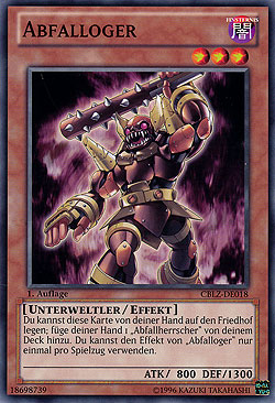Du kannst diese Karte von deiner Hand auf den Friedhof legen; füge deiner Hand 1 "Abfallherrscher" von deinem Deck hinzu. Du kannst den Effekt von "Abfalloger" nur einmal pro Spielzug verwenden.